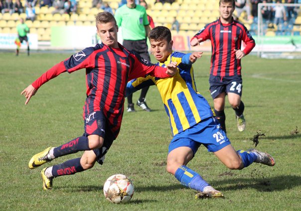 Alex Stoica (foto, jos) a împlinit 18 ani pe 30 iunie şi a fost împrumutat la începutul lui septembrie de la FC Viitorul. Tânărul fotbalist este primul jucător care înscrie, în acest sezon al Ligii 2, de patru ori într-un singur meci.