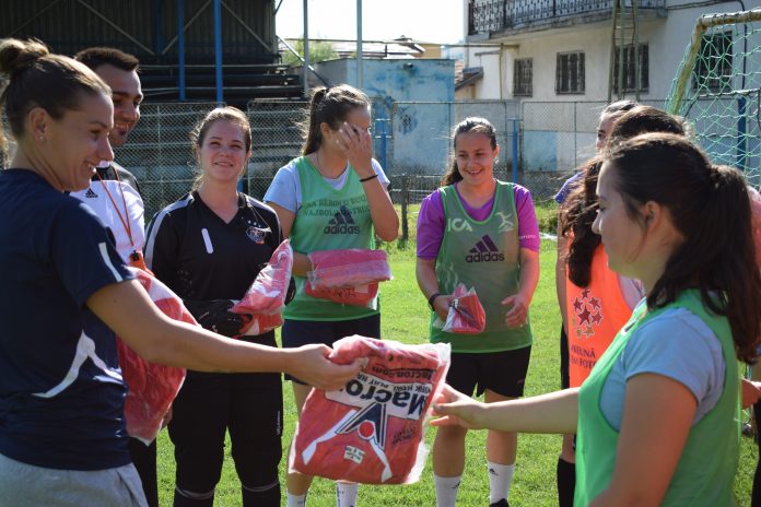Însoțită de tatăl ei, un fost fotbalist la Metalul Bocșa, Laura Rus le-a oferit jucătoarelor de la Banat Girls echipamentul promis, după care le-a încântat cu tehnicitatea sa, într-un antrenament desfășurat cu zâmbetul pe buze.