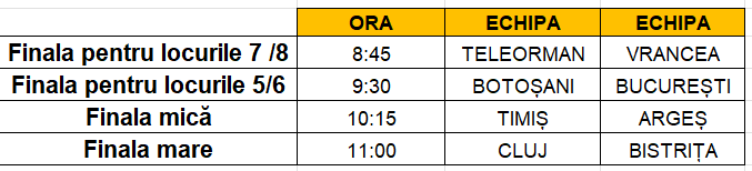 În marea finală se vor întâlni Liceul cu Program Sportiv Cluj Napoca și Liceul cu Program Sportiv Bistrița, iar duelul pentru locul 3 de pe podium se va da între Colegiul Național Bănățean, Timișoara și Liceul cu Program Sportiv „Viitorul”, Argeș.