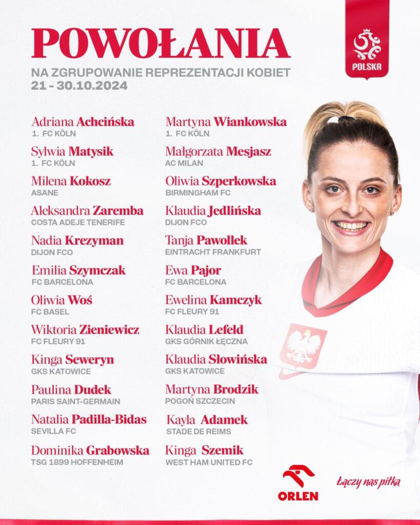 Dintre cele 24 de jucătoare convocate de selecționerul Nina Patalon, doar patru evoluează în competiția internă din Polonia, restul de fotbaliste provenind de la cluburi din Spania, Italia, Germania, Franța sau Anglia.