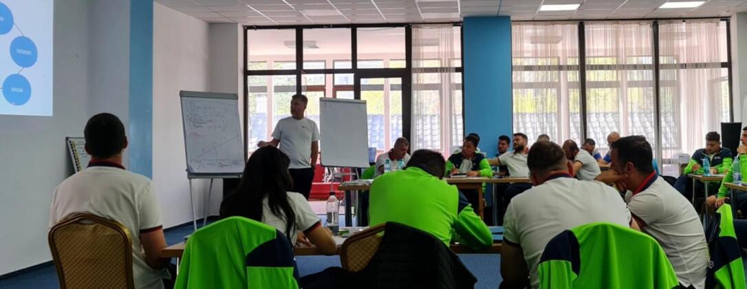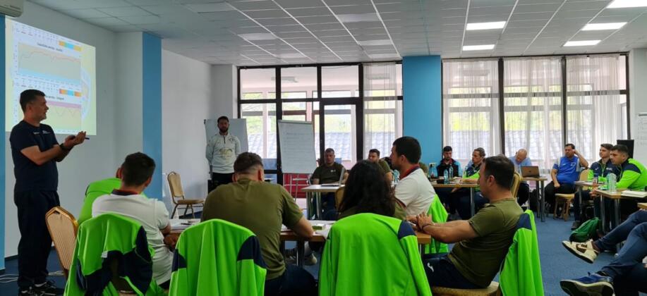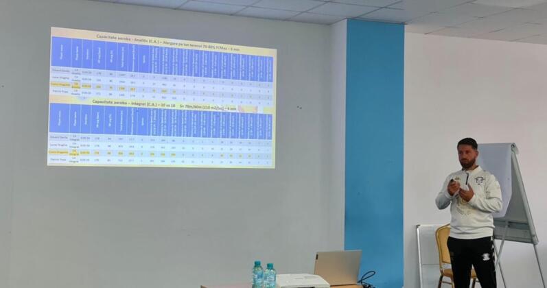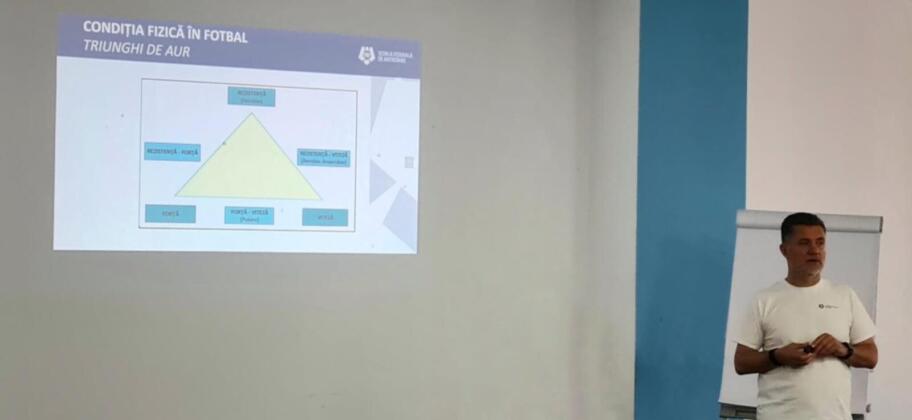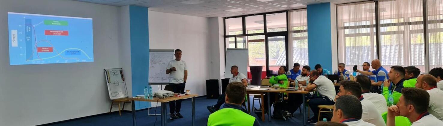 În prima parte a zilei de luni, când a fost analizat conceptul „triunghiului de bază al condiției fizice a fotbalistului”, cursanții au învățat cum să stabilească raportul lucru – pauză atât pentru antrenamentele care au rezistență (aerobă și anaerobă), cât și pentru antrenamentele de viteză. Combinația de prezentări teoretice, întrebări din partea cursanților și lucru pe micro-grup i-a ajutat pe cei prezenți să-și clarifice și stabilească reperele legate de aceste noțiuni.