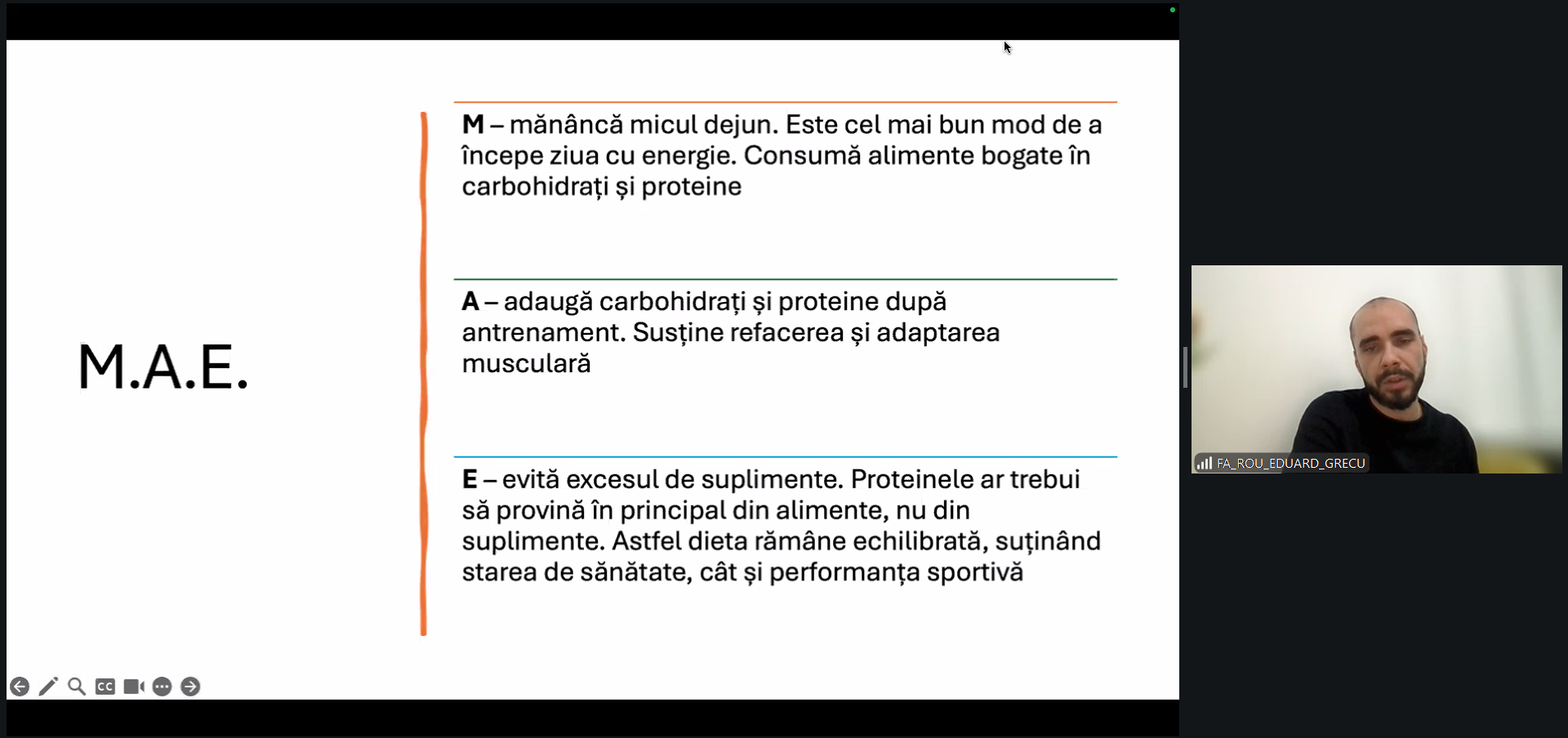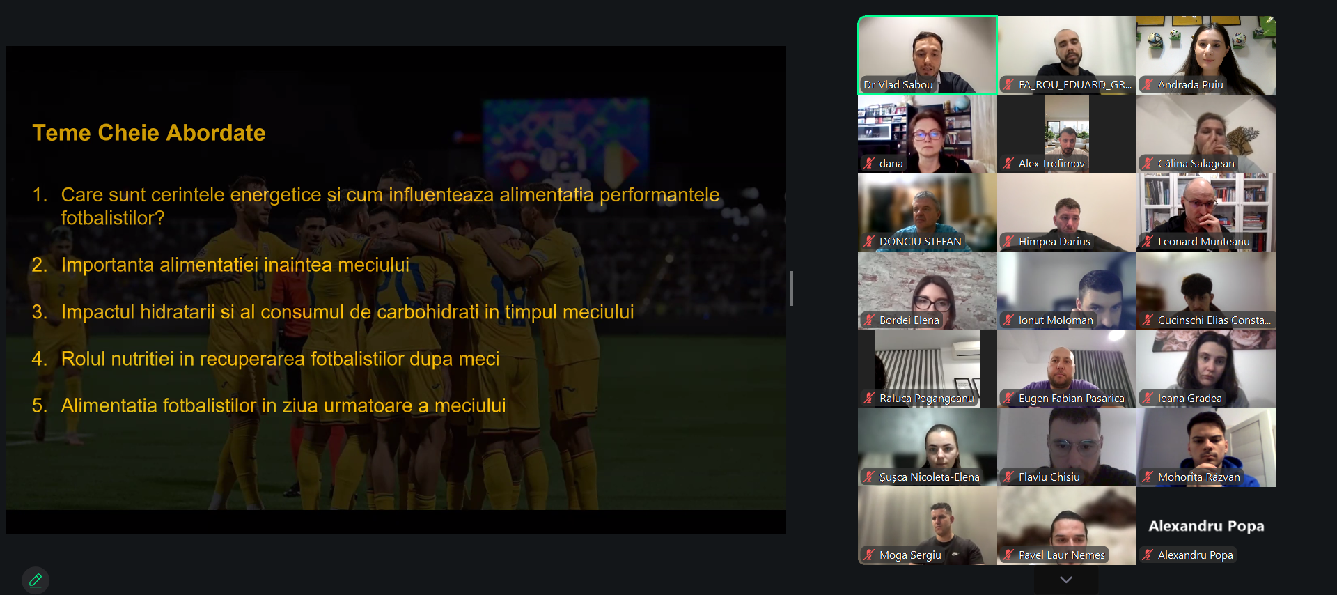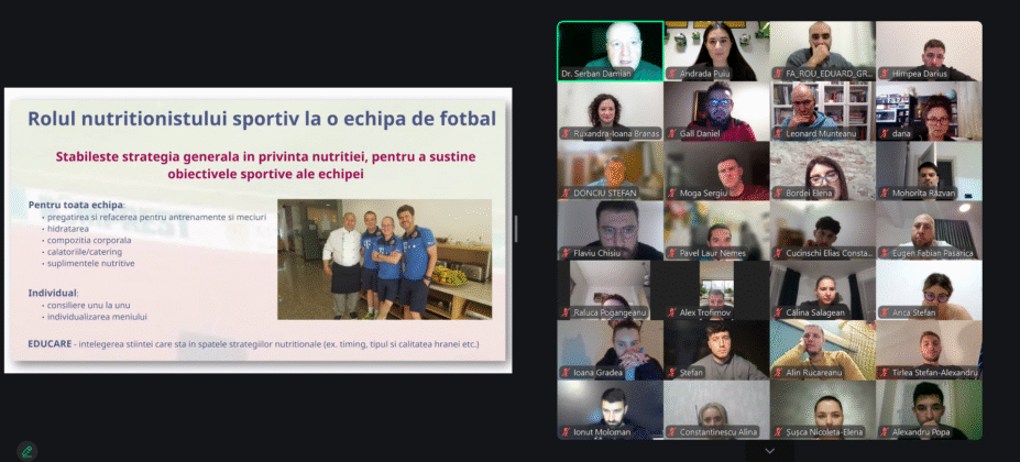 Această formare a oferit o introducere în nutriția sportivă dedicată fotbaliștilor de performanță. Au fost discutate strategii nutriționale pentru zilele de antrenament, ziua meciului și perioada de recuperare, precum și utilizarea suplimentelor sportive.