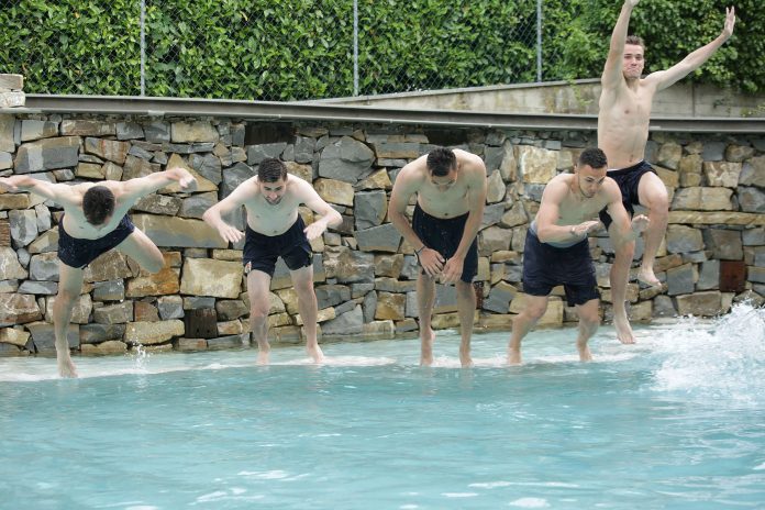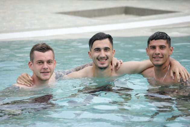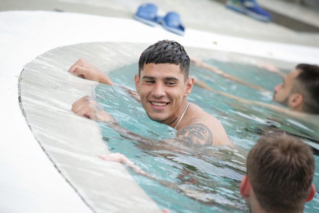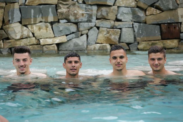 Luni, 10 iunie, elevii lui Mirel Rădoi au avut parte de o surpriză: au efectuat o ședință de pregătire la piscina hotelului unde sunt cazați.
